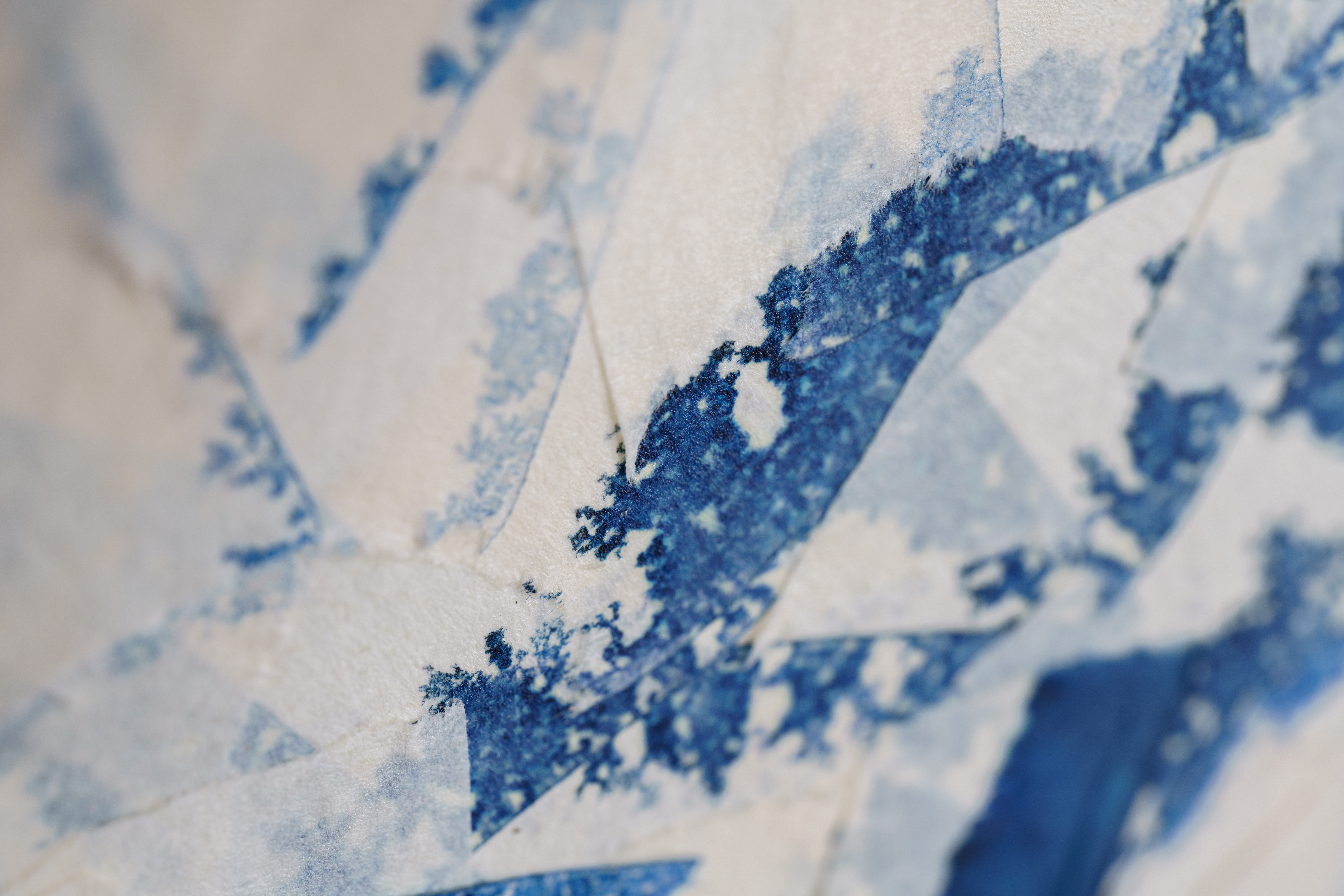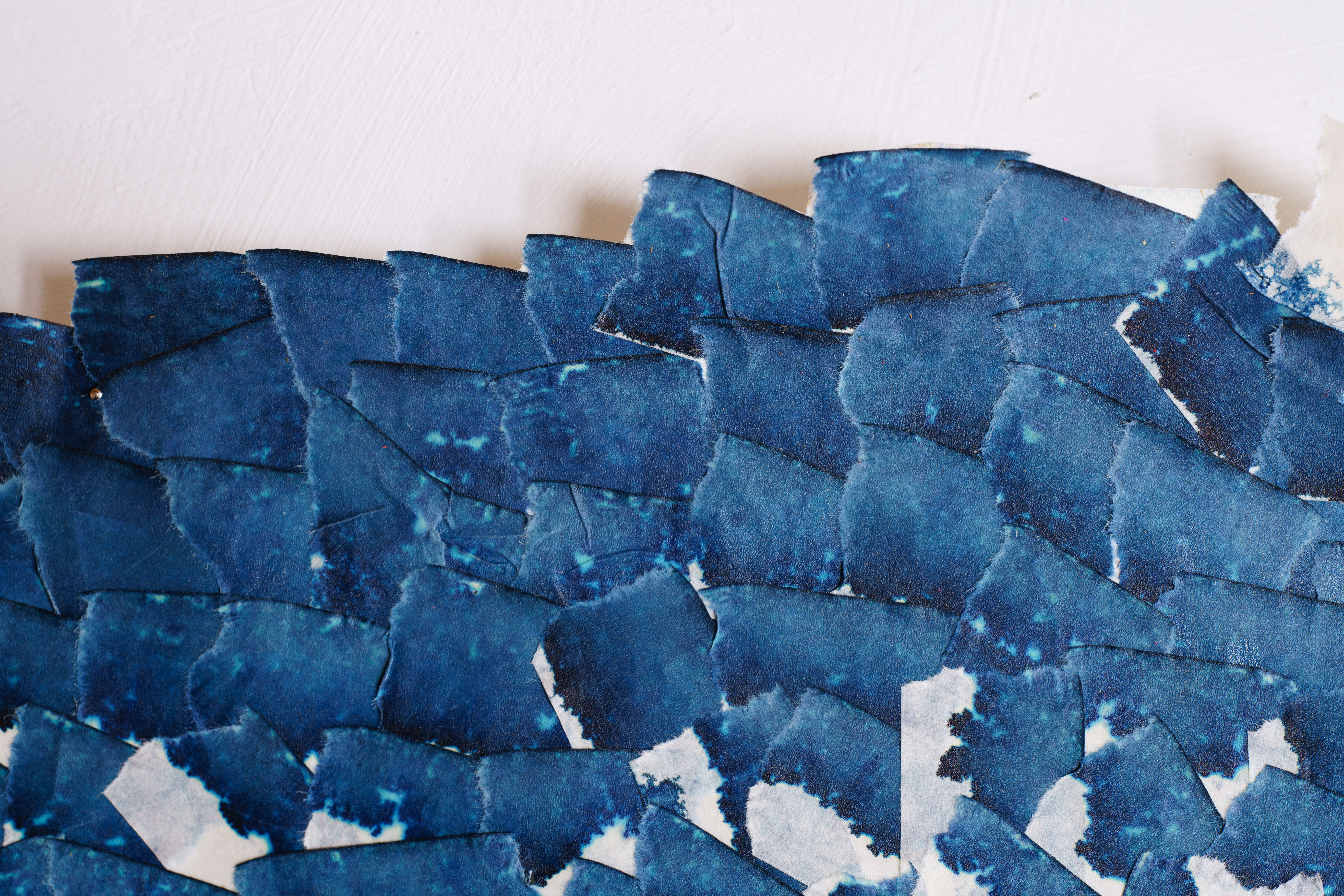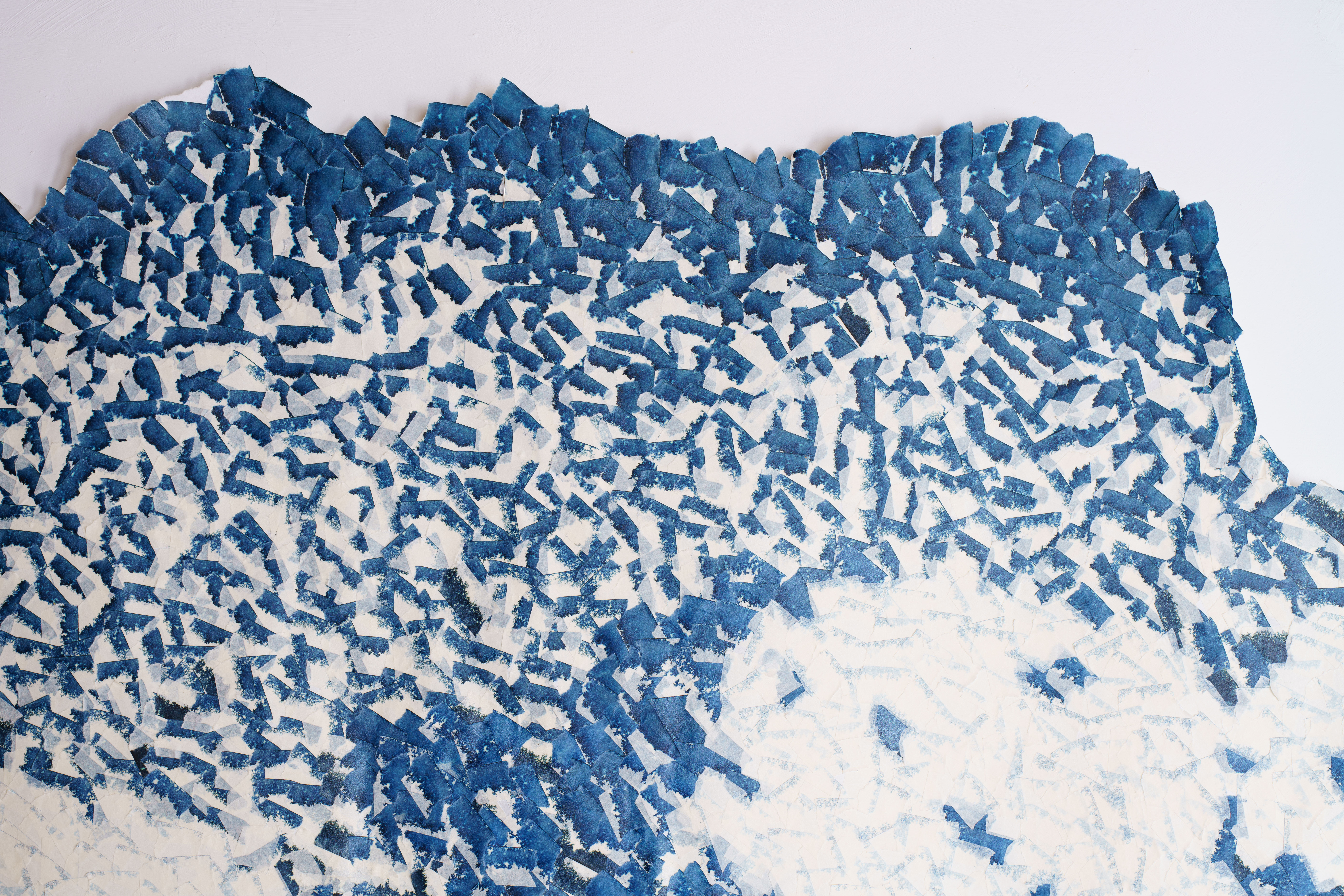 L’ensemble est foisonnant, les bords incertains. Déchirer/recoller, déchirer/recoller, à chaque extrait le pouce appuie sur le papier qui petit à petit disparaît. Éloigner/ rapprocher, le balancement est incessant et rythme le temps de travail. La chorégraphie naît des gestes nécessaires. Les morceaux gagnent par envahissement. Migration qui ne s’arrêtera qu’une fois la matrice saturée. Alors seulement apparaît le dessin. Un coupon de papier recouvert de traces d’encre. Une multitude de petits morceaux de bandes chargés chacun du bruit de la déchirure qui portent à nos yeux, la pulsation vitale du monde.